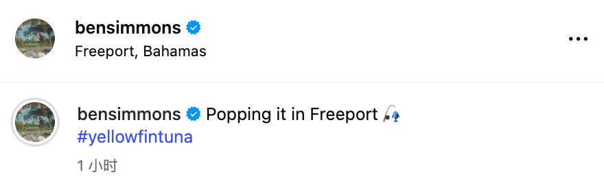 北京时间3月25日,稍早前,本-西蒙斯更新社媒,定位巴哈马,晒出自己钓鱼的相关动态,并且配文写道:“在自由港钓到大鱼了。”