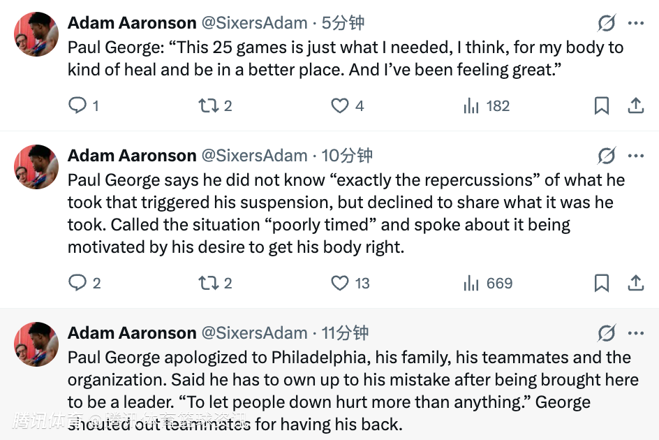 随后,乔治向自己家人、队友以及球队管理层道歉,他表示,既然球队把他请来当领袖,他就必须为自己的错误负责:“让大家失望了,这比任何事都让我难受,感谢队友们在这段时间里的支持。”
