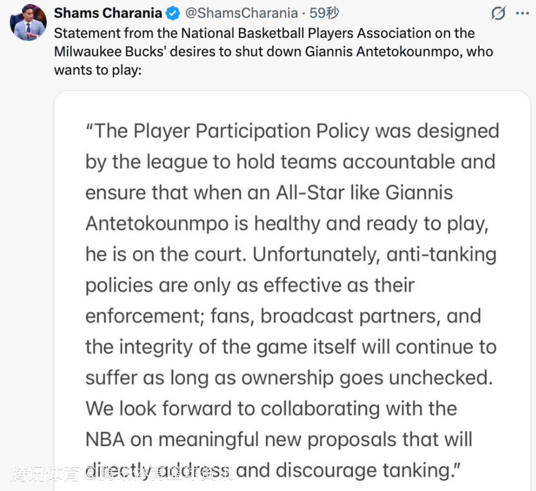 北京时间3月25日,据名记Shams报道,NBA球员工会就密尔沃基雄鹿队想要轮休字母哥(而字母哥本人希望出战)一事发表声明。