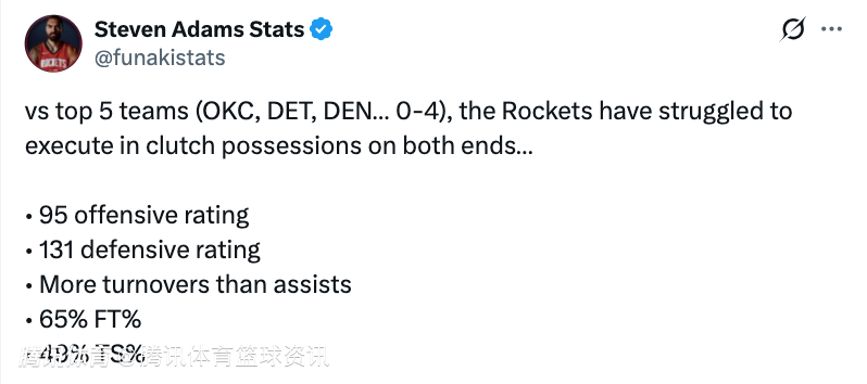 而另外一家火箭自媒体账号Steven Adams Stats也晒出了球队本赛季对阵联盟前五球队(雷霆、掘金、马刺、活塞、湖人;目前0胜5负)关键时刻(最后5分钟、分差小于等于5)相关数据,具体如下: