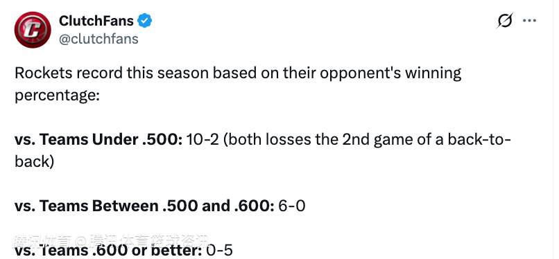 北京时间12月17日,近日,火箭媒体ClutchFans晒出了本赛季火箭对阵不同实力球队时的战绩,具体如下:
