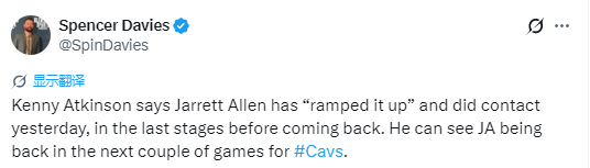 阿特金森表示,艾伦已经加大训练强度,并且在昨天参加了对抗训练,目前处于复出前的最后阶段。他预计艾伦将在接下来的一两场比赛中为骑士队复出。