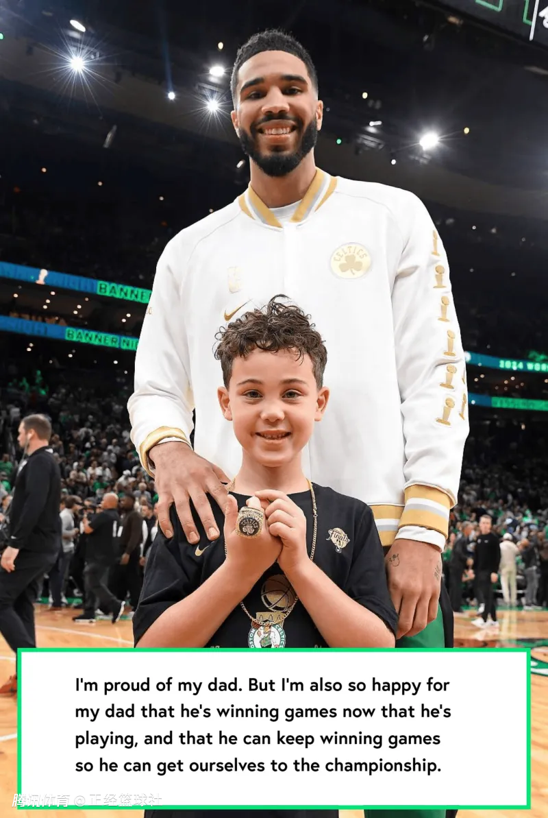 同时,塔图姆八岁儿子Deuce写给父亲的亲笔信曝光。在亲笔信中,Deuce坦诚诉说了父亲受伤时自己的难过:“爸爸刚受伤的时候,我很难过。为了让他开心,我会给他一个拥抱,或者叫弟弟迪伦过来和他依偎在一起。我会问爸爸为什么难过,然后给他出主意,让他去做些别的事情,而不是一直想着让他难过的事。”他还写道:“我为我的爸爸感到骄傲,但我更为他感到高兴,因为他现在能上场比赛并且一直在赢球。我希望他能继续赢下去,这样我们就能拿到总冠军。”