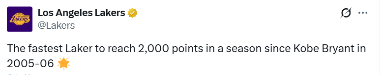 另据湖人官方数据显示,东契奇成为2005-06赛季科比之后,队史单赛季最快突破2000分的球员。本赛季湖人共出战72场比赛,东契奇登场60次,场均贡献33.4分7.9篮板8.4助攻1.6抢断。