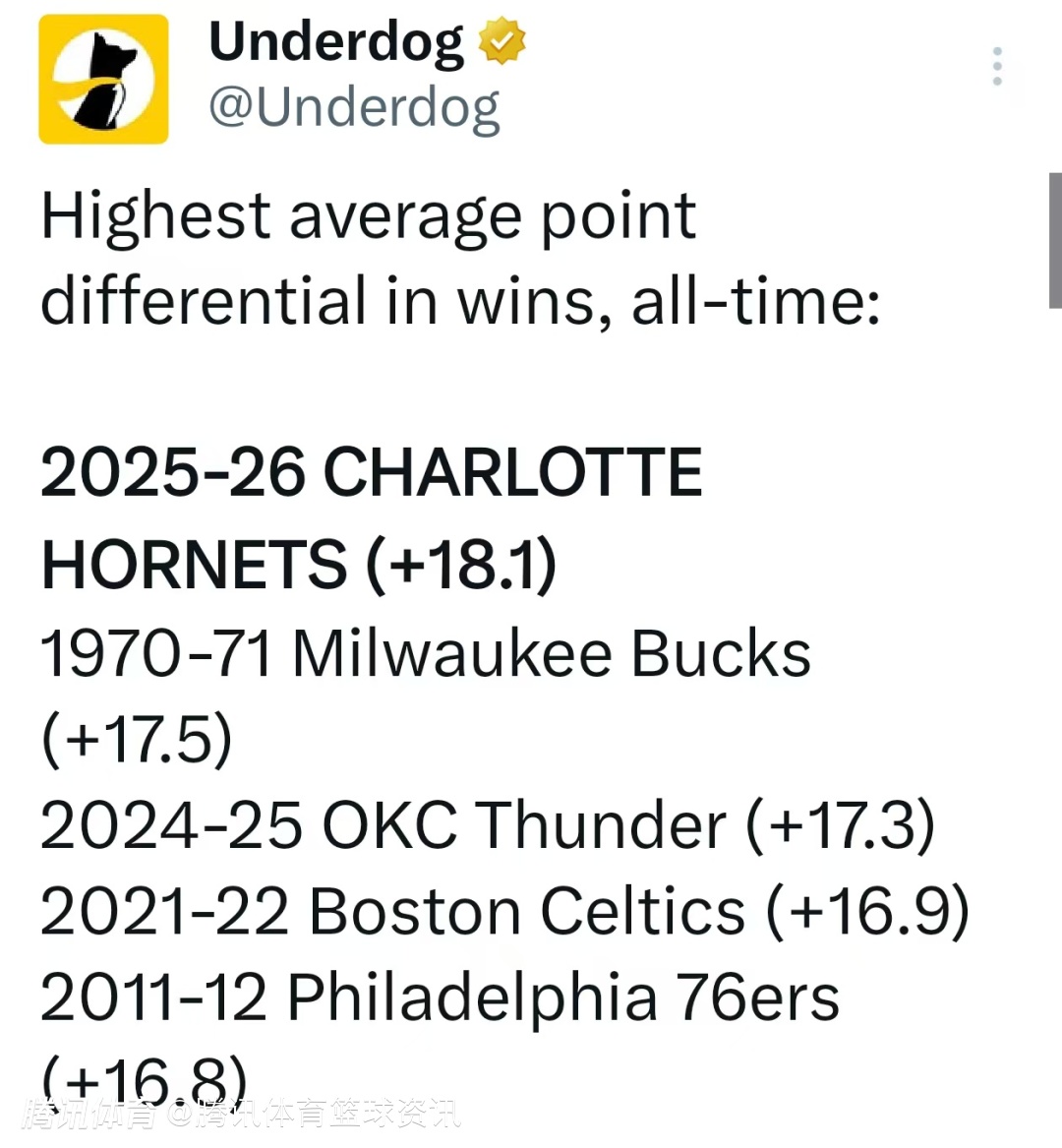 根据数据统计显示,黄蜂就此拥有NBA历史上最高的胜场净胜分均值。