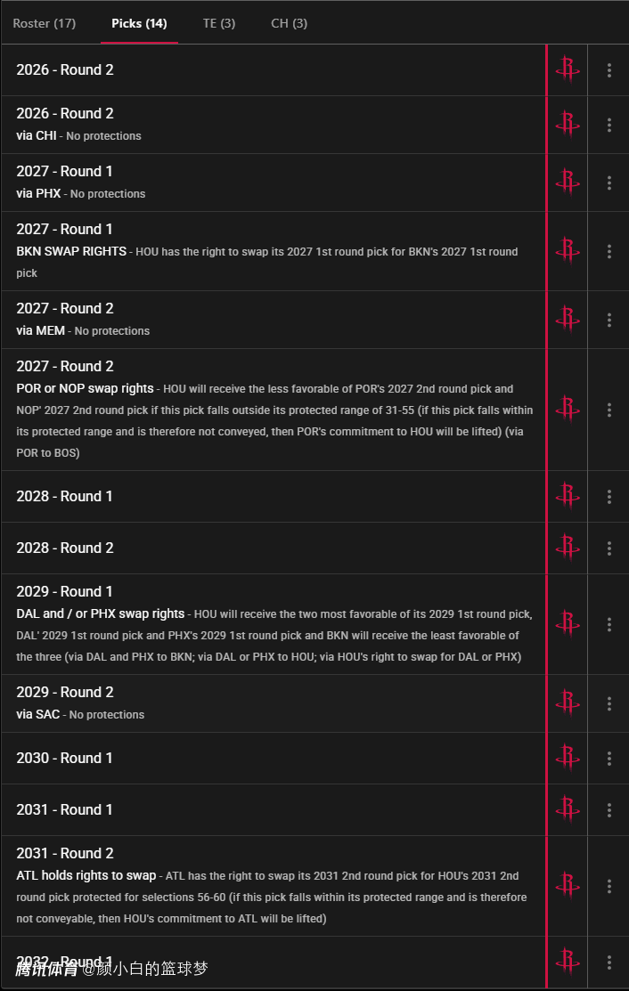 为何火箭队说他们有可以满足雄鹿的筹码呢?除了有像申京、伊森这样的出色年轻资产、杜兰特这样还在联盟顶级水准的球星外,火箭队未来6年里还有6个首轮签7个次轮签1个首轮互换权,雄鹿作为重建的球队他们最需要的就是选秀权资产。