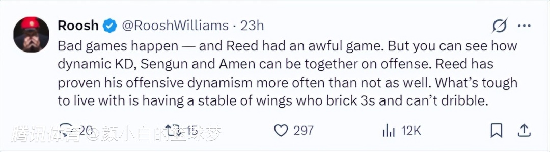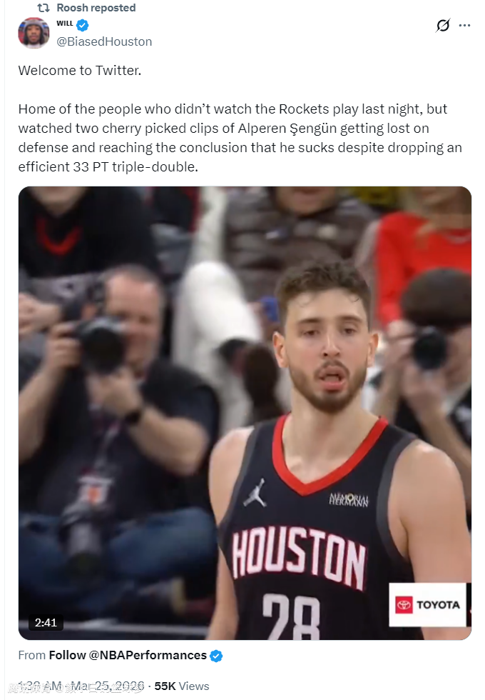 休媒Will写道:欢迎来到推特,这里住着一群不看火箭比赛的家伙,但他们看到申京在最后时刻的两个防守失位就得出申京很糟糕的结论,尽管申京19中16拿到33+13+10的超级三双。