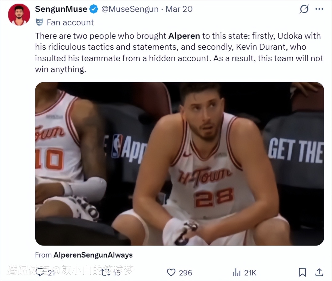 几天前申京的球迷也这样评价,导致申京陷入困境的理由有两点:1.乌度卡,他采用了诸多荒谬的战术与言论;2.杜兰特,他通过一个隐藏的账号对队友们进行了侮辱。因此这支球队将一无所获。(实际上杜兰特隐藏账号事件已经辟谣)