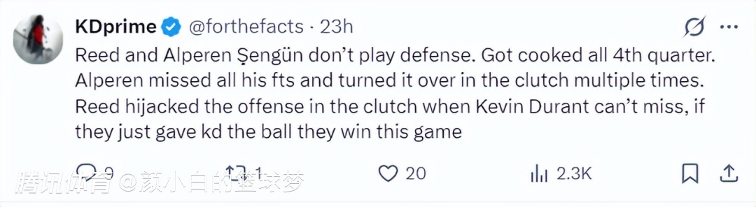 杜兰特的球迷:谢泼德、申京根本不擅长防守,他们在第四节全被打垮了。申京一个罚球都没有命中,关键时刻也出现了多次失误(实际上全场仅2失误)。在关键时刻谢泼德掌控进攻节奏不给杜兰特传球,如果他们把球交给他,他就能赢得比赛。