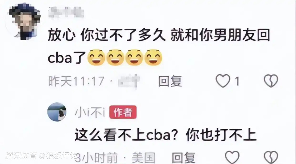 从曝光的评论区截图来看,有黑子嘲讽道:“放心 你过不了多久 就和你男朋友回CBA了”,对此,她毫不客气地回怼:“这么看不上CBA?你也打不上”。还有人恶意污蔑她 “你真不要脸,回国干点自己的事吧,别天天追着杨瀚森要钱”,她则以 “自己没有就觉得别人也没有 哈哈” 来巧妙反击,点破对方的狭隘心理。