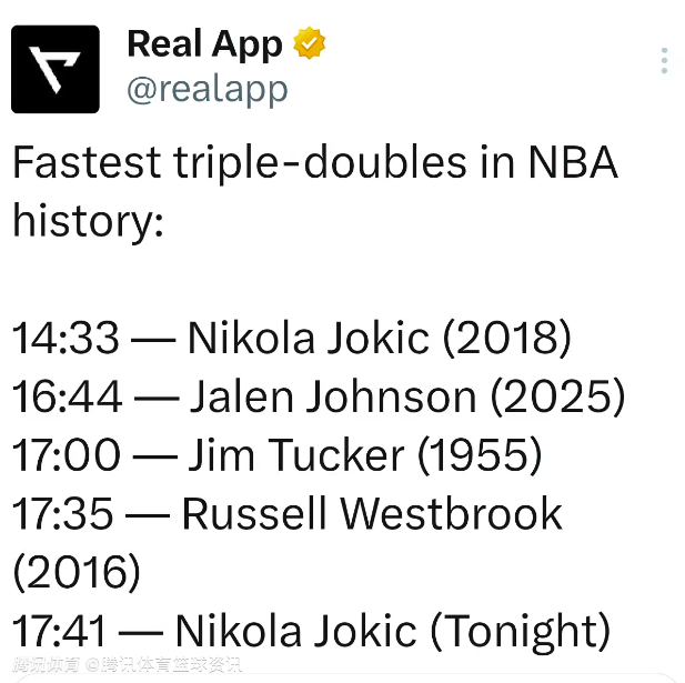 与此同时,约基奇本场仅用17分41秒就拿到三双,位列NBA历史第五快;他还曾在2018年以14分33秒创下历史最快三双纪录。