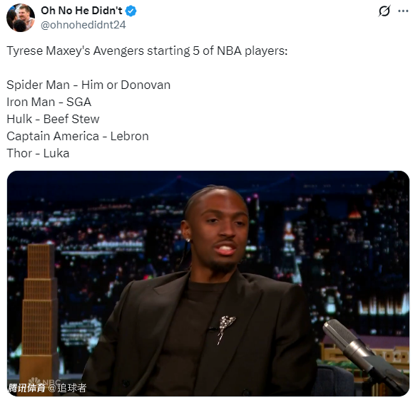 北京时间3月25日,76人球星马克西做客脱口秀节目《Tonight Show》,期间马克西评选NBA版复仇者联盟阵容,詹姆斯美国队长,东契奇雷神SGA钢铁侠,活塞悍将斯图尔特是绿巨人。