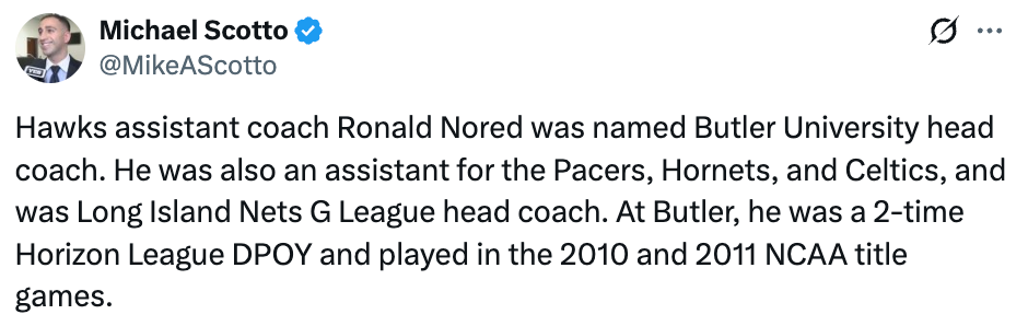 北京时间3月25日,据名记Scotto报道,老鹰助教罗纳德-诺雷德被任命为巴特勒大学主教练。