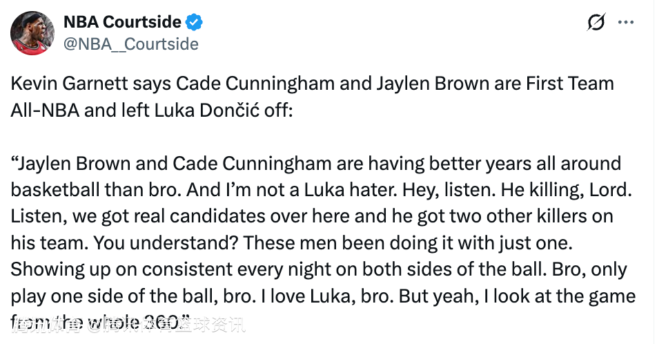 加内特表示,凯德-坎宁安和杰伦-布朗应该入选NBA最佳阵容一阵,并把东契奇排除在外:“杰伦-布朗和坎宁安在篮球的综合表现上,比那哥们(东契奇)更好。我不是卢卡黑,听着,他确实很强,你要明白,我们这边有真正的候选人,而他(东契奇)队里还有另外两个顶级球星。”