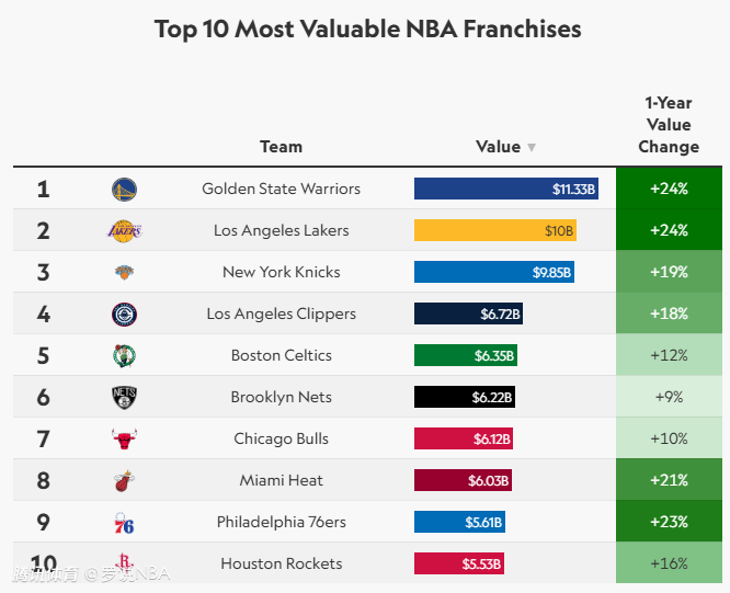 和之前一年相比,这10支球队市值增幅最大的是勇士和湖人,都有24%的提升,而10支球队中增幅最小的篮网,也能达到9%。