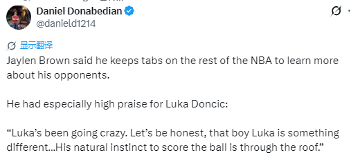 布朗说道:湖人这边,东契奇最近状态简直疯了。说实话,这小子真的是独一档的存在,兄弟。他的得分能力、那种天生的得分本能、投篮手感都是与生俱来的。作为一个篮球迷,我一直都在看球,关注我最喜欢的球队,也一直在研究比赛,琢磨对手,让自己变得更好。”