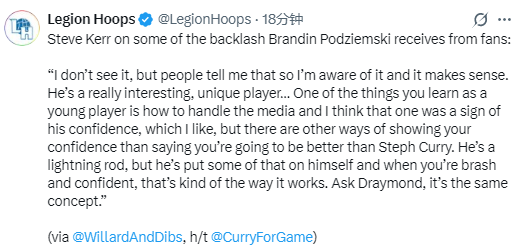 科尔表示:“我自己没看到这些批评,但有人跟我说过,所以我知道这事,而且这也说得通。他是个非常有趣、很独特的球员……作为年轻球员,你要学会的一件事就是如何应对媒体。我认为他之前的那句话是自信的表现,这点我喜欢,但展现自信的方式有很多种,不一定要说自己会比库里更强。”