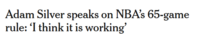 北京时间3月26日,NBA总裁亚当-萧华表示,联盟现行的65场出战资格规则目前运行成功,尽管本周球员工会公开呼吁修改这一规定,但他暂时无意做出调整。