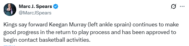 北京时间3月26日,国王官方更新球队伤情进展,基根-穆雷在2月25日对阵火箭的比赛中扭伤左脚踝,经过恢复期后已取得良好进展,获准进行有接触篮球活动。威少则因右脚疼痛缺席近两战,检查结果显示右脚大脚趾关节发炎,仍将伤停。