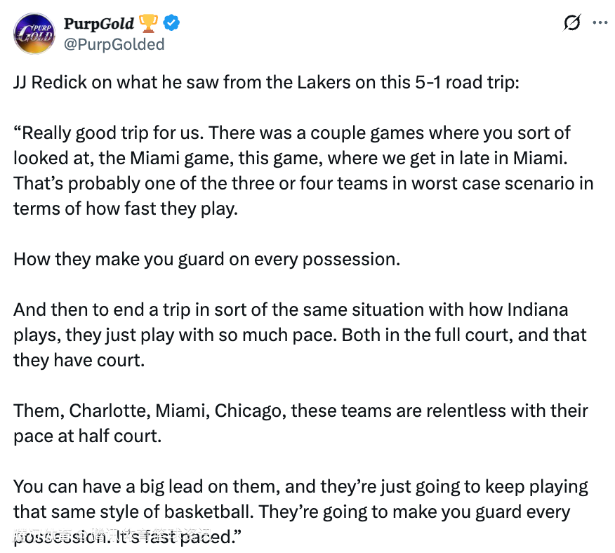 谈及湖人5胜1负的客场之旅,雷迪克表示:“这次客场之旅真的很棒。有几场比赛你会印象深刻,比如对阵迈阿密热火那场,还有今天这场——我们很晚才抵达迈阿密。那支球队大概是全联盟节奏最快的三四支球队之一。”