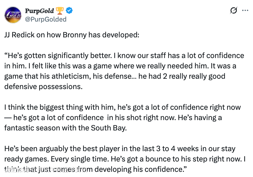 谈及关于布朗尼的成长,雷迪克表示:“他取得了肉眼可见的进步。我知道我们的教练组对他充满信心。我觉得今天这场比赛我们真的很需要他,他的运动能力、他的防守——他贡献了两次非常关键的成功防守。我认为对他来说最重要的一点是,他现在自信心很足,尤其是在投篮方面。他在南湾湖人队度过了一个出色的赛季。在过去3到4周的待命比赛里,他可以说是我们表现最好的球员,每一场都是如此。他现在的步伐都带着活力,我觉得这正是自信提升带来的变化。”