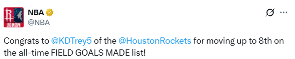 北京时间3月26日,NBA常规赛,火箭对阵森林狼,杜兰特迎来里程碑,让自己的生涯进球数超越诺天王,升至历史第八。