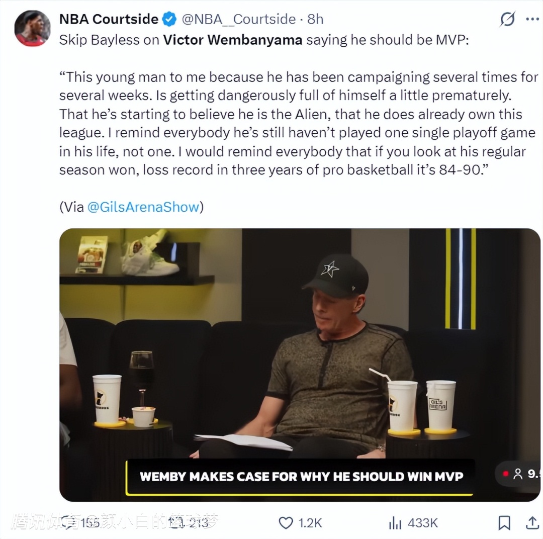 名嘴斯蒂芬-A-史密斯已经开始力挺文班亚马:他公开支持自己应该拿到MVP,我们应该明白文班亚马不仅有希望拿到最佳防守球员、MVP、总冠军,他根本不屑跟SGA、布朗等人去作比较,我认为他就是MVP。