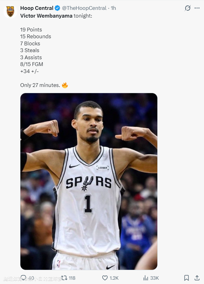 这场比赛文班亚马短短27分钟,15中8,三分3中1,罚球3中2,拿到19分15篮板3助攻3抢断7盖帽,命中率53.3%,正负值+34,他是真的太出色了,攻防两端毫无软肋可言。