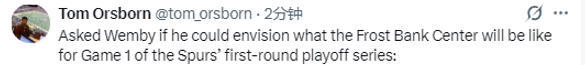 马刺队目前已经锁定了季后赛首轮的主场优势,在谈到能否想象季后赛首战马刺主场的氛围时,文班亚马表示:“当然能想象。底线区域、看台观众肯定都会坐满。我还能想到,现场说不定会有不少法国球迷,之前几次他们来现场时,都带来了超棒的能量,和球队很有共鸣。我现在只能大致预想一下,但真的超级兴奋。我相信现场氛围一定会超出我的期待。”