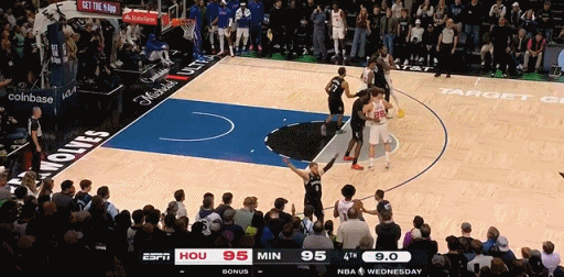 第四节最后关头,申京先是在火箭94-95落后1分时制造了戈贝尔6犯,让杜兰特利用罚球将比分追平。随后火箭队发动最后一攻,但杜兰特与申京挡拆后传球被断,森林狼反击,兰德尔顶着杜兰特上篮,但申京此时却回防到位,一巴掌将球扇飞,他本人在盖帽后也摔倒在地。