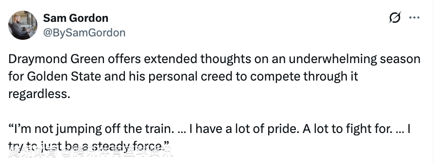 就金州勇士队这个令人失望的赛季,以及他个人无论如何都要坚持战斗的信条,追梦表示:“我不会半途而废,我有很强的自尊心,有很多值得去拼搏的东西,我只想做一股稳定的力量。”