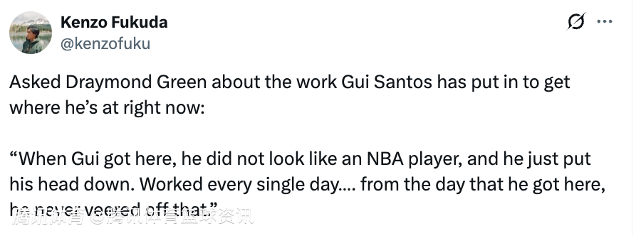 谈及此役拿到31分的桑托斯,追梦表示:“他刚到球队的时候,看起来完全不像是一个能打NBA的球员。但他就是埋头苦练,每一天都如此。你早一点来球馆,通常他都已经练完了;你按自己的时间提前到,他一般也都结束了他自己的训练。今天他也是很早就来了。”