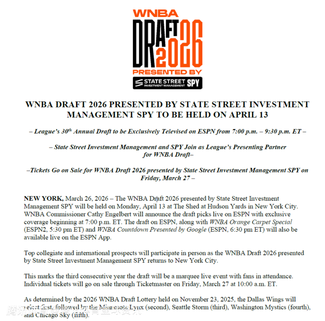 北京时间3月27日,WNBA官方宣布,WNBA2026年选秀大会将于美国当地时间4月13日(北京时间4月14日)举办。