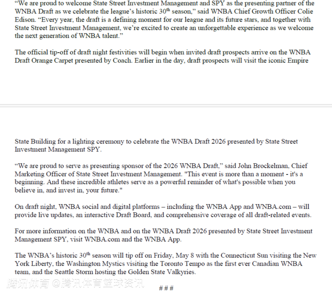 “我们很自豪欢迎道富投资管理与SPY成为WNBA选秀大会的首席合作伙伴,共同庆祝联盟具有历史意义的第30个赛季。”WNBA首席增长官科利-爱迪生表示,“每年的选秀大会都是联盟及其未来新星的决定性时刻,我们期待与道富投资管理携手,为迎接下一代WNBA人才打造一场难忘的体验。”