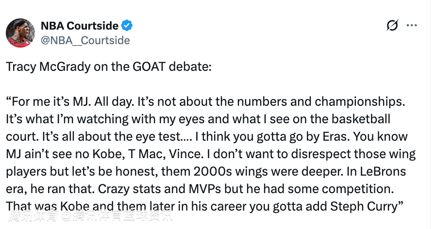 北京时间3月27日,近期,NBA名宿麦迪在节目中谈到了关于GOAT的话题。