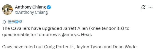 北京时间3月27日,NBA常规赛继续进行,骑士明日对阵热火。赛前,骑士方面更新球队本场比赛伤情报告,已缺席10场比赛的艾伦升级为出战成疑。
