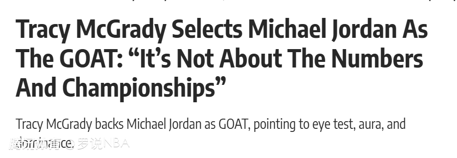 北京时间3月27日,谈及“历史最佳(GOAT)”之争,特雷西-麦克格雷迪毫不犹豫。在他看来,答案很简单——迈克尔-乔丹。而且这无关数据,也无关总冠军戒指,只关乎他亲眼所见的一切。