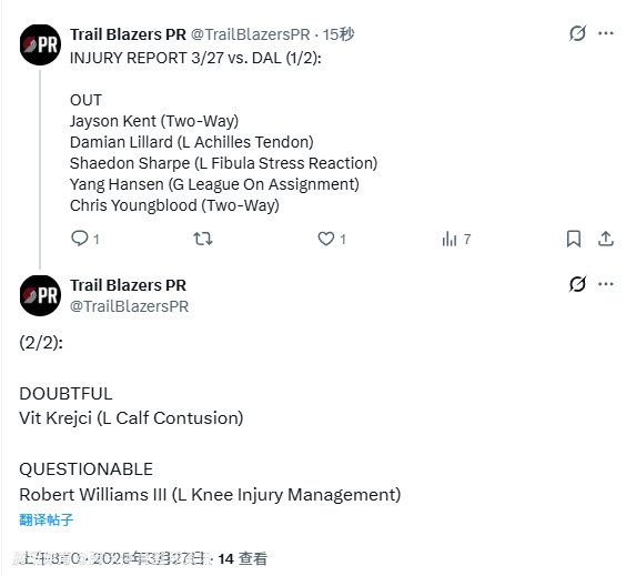 北京时间3月27日,开拓者队公布了明日对阵独行侠队比赛的伤病报告,杨瀚森因被下放至G联赛缺席比赛,具体情况如下: