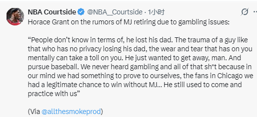 北京时间3月27日,前NBA球员“眼镜蛇”霍勒斯-格兰特参加播客节目,期间他谈到了迈克尔-乔丹因赌博传闻选择退役的流言,并对流言进行了否定。