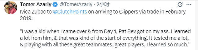 在谈到快船队的致敬视频和球迷时,祖巴茨说道:“快船球迷太棒了,我刚来到这里时还很年轻,是他们接纳了我,一直支持着我,即便有时我表现不佳也始终如此。他们永远是我最坚实的后盾,永远信任我,他们是世界上最棒的球迷群体之一。看到那段视频,看到全场一万到一万五千名球迷都起身为我欢呼时,我感到无比自豪。我心里想着,‘我在这里总算没有白努力’,能感受到他们的喜爱与支持,我真的倍感荣幸。”