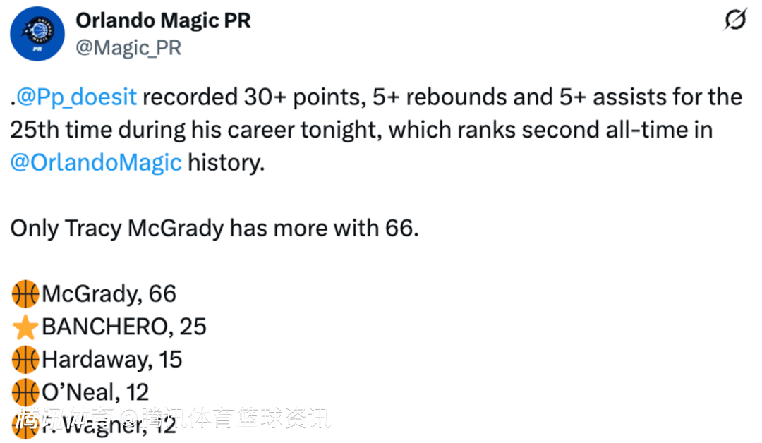 据统计,这是班凯罗生涯第25次砍下至少30+5+5,这一成就位列奥兰多魔术队史第二位,