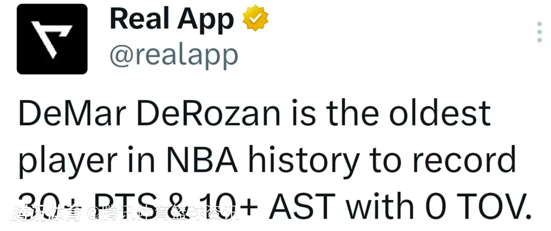 根据数据统计显示,凭借本场表现,德罗赞以36岁232天的年纪,就此成为NBA历史上拿到30+得分10+助攻且0失误的最年长球员。