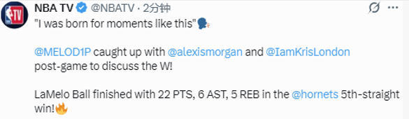 北京时间3月27日,NBA常规赛继续进行,黄蜂队114-103击败尼克斯队。拉梅洛-鲍尔此役得到22分5篮板6助攻,赛后他接受媒体采访。