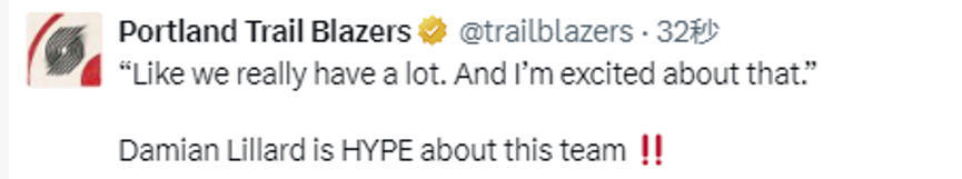北京时间3月27日,开拓者队官方社交媒体发布了一段利拉德的采访,他表示自己对于如今的这支开拓者队感到兴奋,也想要在未来复出后带领球队赢球。