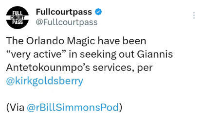 戈德斯伯里表示:“我其实听说过一支神秘球队。为了弄清哪些球队迫切想要得到字母哥,我特意多方打听了一番。有知情人士告诉我,奥兰多魔术在争取字母哥加盟这件事上,一直表现得非常积极。”