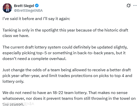 打进季后赛的球队,完全不该有任何机会拿到乐透签。这根本不是解决现有制度问题的正确方式。这么改只会让那些真正缺乏天赋、赢不了球的球队,变强的机会变得更小,最后永远陷入烂队泥潭。