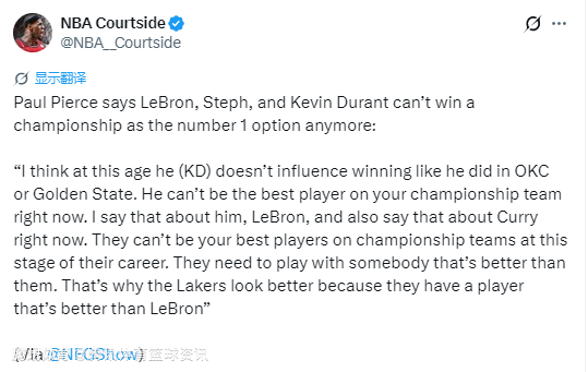 北京时间3月27日,NBA名宿保罗-皮尔斯在直播节目中表示,詹姆斯、库里和杜兰特如今都无法再以第一核心的身份夺冠。
