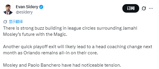 据悉,若魔术再次在季后赛早早出局,球队很可能在下个月更换主教练,因为魔术仍对现有核心阵容全力投入。此外,莫斯利与班凯罗之间已出现明显的关系紧张。