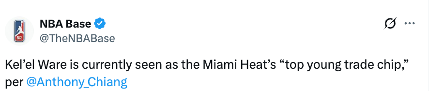 北京时间3月28日,据热火队记Anthony Chiang报道,韦尔目前被视为迈阿密热火队的 “头号年轻交易筹码”。