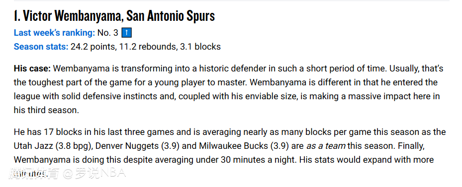 NBA官网最新的MVP排行榜上,文班从第三升至第一。相关点评写道:“文班亚马在极短时间内,就成长为历史级别的防守者。通常来说,防守是年轻球员最难掌握的环节。但文班亚马与众不同,他进入联盟时就拥有出色的防守本能,再加上得天独厚的身体尺寸,生涯第三季便在防守端打出了统治级影响力。过去三场比赛他送出17记盖帽,本赛季场均盖帽数,几乎追平犹他爵士(3.8次)、丹佛掘金(3.9次)、密尔沃基雄鹿(3.9次)这三支球队的全队场均盖帽数。更关键的是,文班亚马做到这一切的同时,场均出场时间还不到30分钟。如果获得更多上场时间,他的数据还会进一步暴涨。”